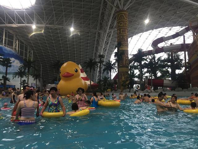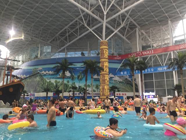 孩子早就想着去游泳玩,戴着我们的设备出发了。快到的时候,路边很多的人卖特价票,我之前吃饭的时候问了问店员,她他们的票倒是真票。我就去问了问价钱。可以搞价的,美团上是106,最后我80搞定。孩子也需要买儿童票,直接在美团上买的45元。 外面写着不让带救生圈什么的,我也没理会,反正我的救生圈还没吹起来,进去一看,大家都自己带了救生圈,水枪,吃的喝的。我没带水,一瓶恒大冰泉5元。