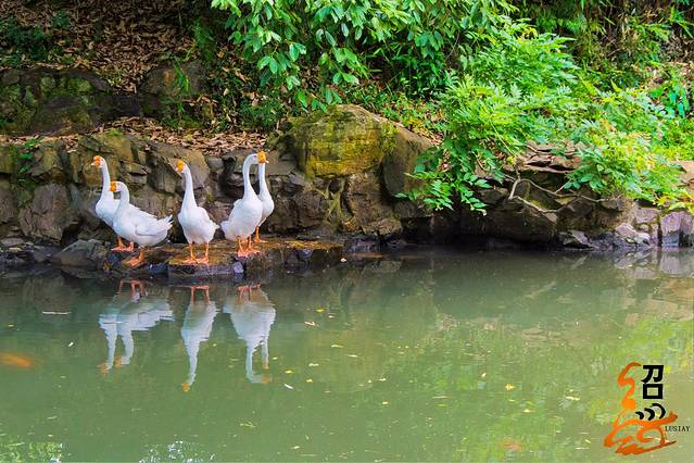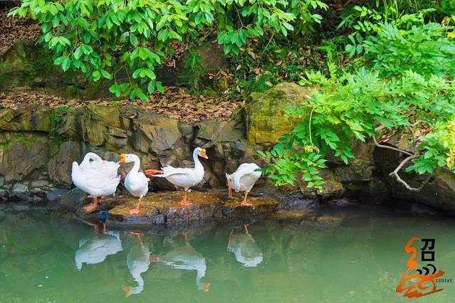往里走便可以看到“鹅池”。现如今池边也还是有几只大白鹅。王羲之爱鹅,也爱写鹅字,所以便有了这鹅池。三角亭下的鹅池碑是王羲之与王献之共同写下的。