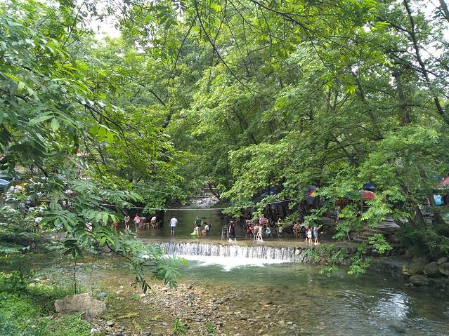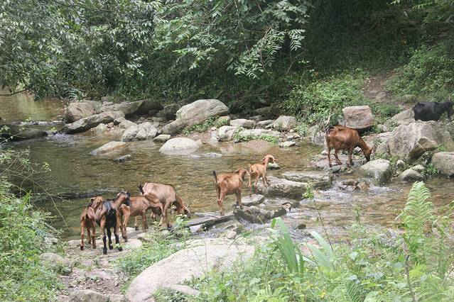 河边都是饭店客栈类,晚上非常热闹,也很吵。逆着河而上,河边的水泥路总体路况良好。桥头有租自行车的,不过听说上坡很多就选择了步行,从后面的路况来看,感觉骑四人自行车还是比较危险的。四人自行车操纵不易,回程的时候下坡较多,而且路较窄,有小客车通过时需要谨慎慢行,有些地方的路边是比较高的河岸。从路边容易下去的地方下到河里,水比较浅,但河水很凉。在一处水流缓慢比较开阔的地方有出租橡皮船的,也有脚踏船。小孩子拿着桨划船,河面上非常清凉,河水清澈见底。