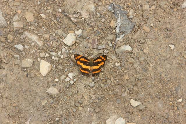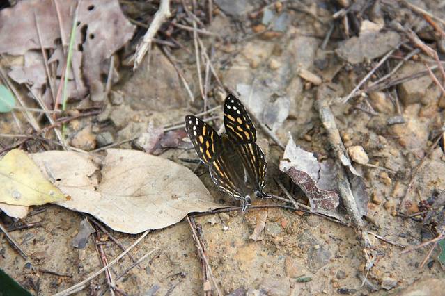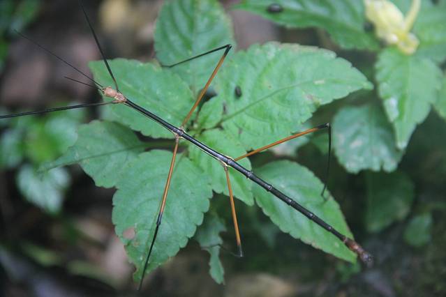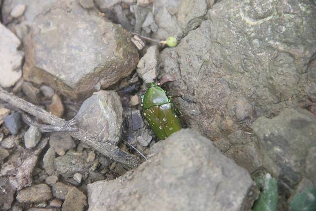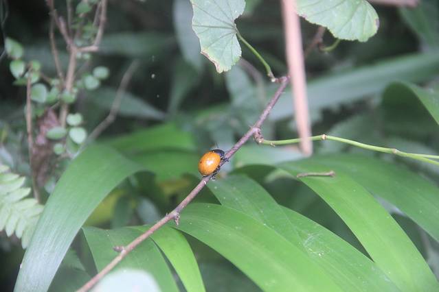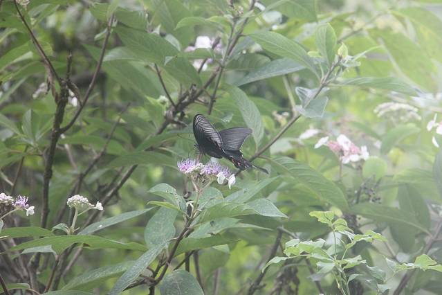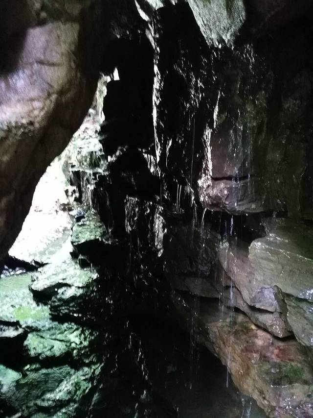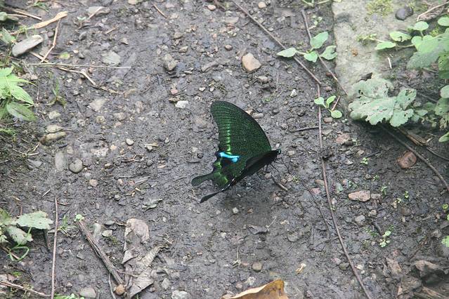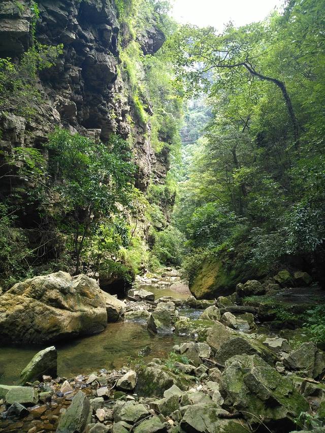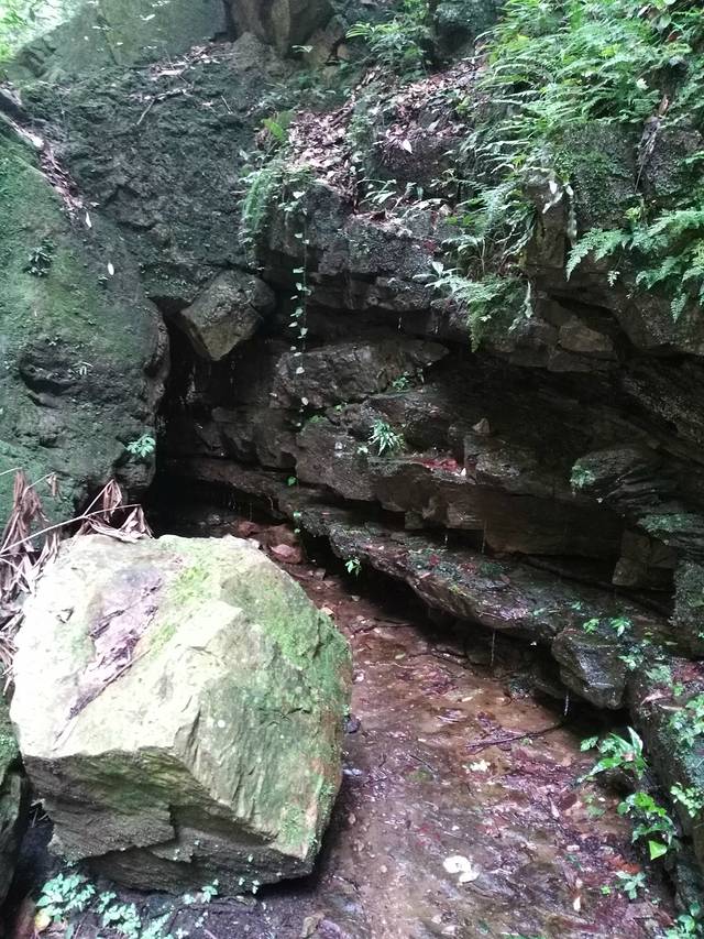 顺着小路右行,行走在崎岖未开发的小路,多处比较泥泞,建议穿防滑底的鞋子并持登山杖。进入树林,由于正值夏季,周围有成千上万只的蝉在齐声大合唱。去往望天峡需要经过多个上行下行。在路边利用树枝做了三个登山杖,感觉助力不少。林中有人采蘑菇,路上发现被人丢弃的蘑菇,还有其它颜色的蘑菇,感觉像是毒蘑菇,没有关于蘑菇的专业知识,只是欣赏而已。对于罕见野生蘑菇的都市人,刚发现时欣喜不已,稍后就对处处隐藏的蘑菇视而不见了。林中很多地方空气潮湿,石头上覆盖着翠绿绒绒的青苔。潮湿的朽木上生长着各种木耳,不时有各色的蝴蝶在上下翩迁起舞,眼尖的孩子竟然发现了一只竹节虫。