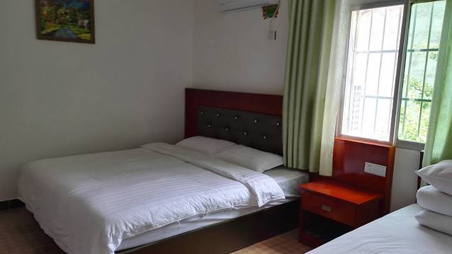 进入景区约五百米道路左边即是我们要入住的嘉里莱客栈,在门前停好车,看了下房间,房屋很整洁,床单被罩墙壁雪白,卫生间干湿分离,没有异味。以农家乐的水准看还是比较满意的。老板看孩子比较大就给免费更换了家庭房。