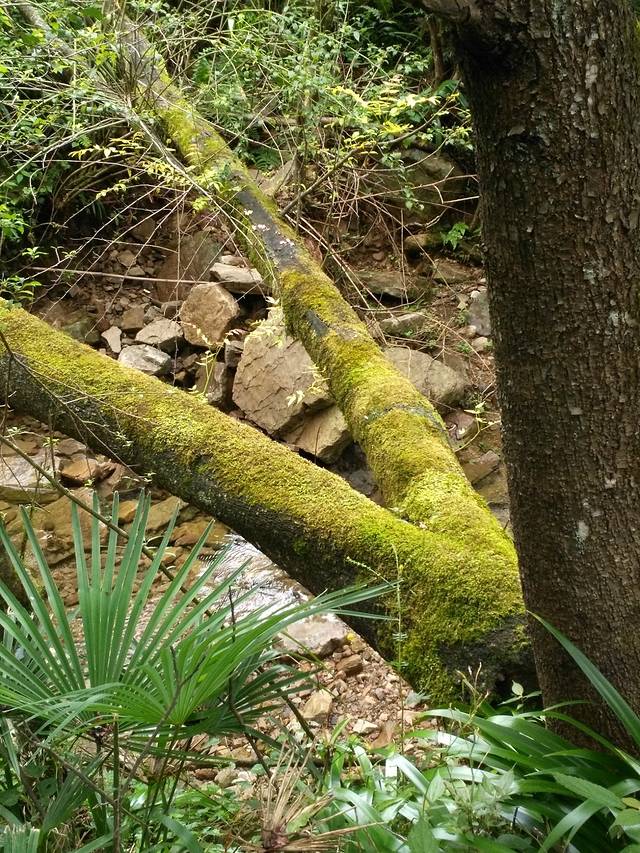顺路而上,旁边的溪水时而出现,时而被河岸的树木遮挡。