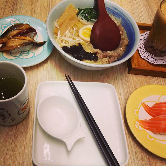看着书,不知不觉就到了中午,要下楼下到地下去吃饭。一开始决定去吃花丸乌冬面,最后发现他家对面的一家寿司新语还有专为单人准备的桌子,和玩具熊对着吃饭,于是就去了这家,店员都是用日语说欢迎光临,找了座位坐了下来,店员拿来了iPad让我自己点餐(还从没见过用iPad点餐,略激动)点了很多花了117元,拉面很好吃,最后留了一串烤茄子给大熊。