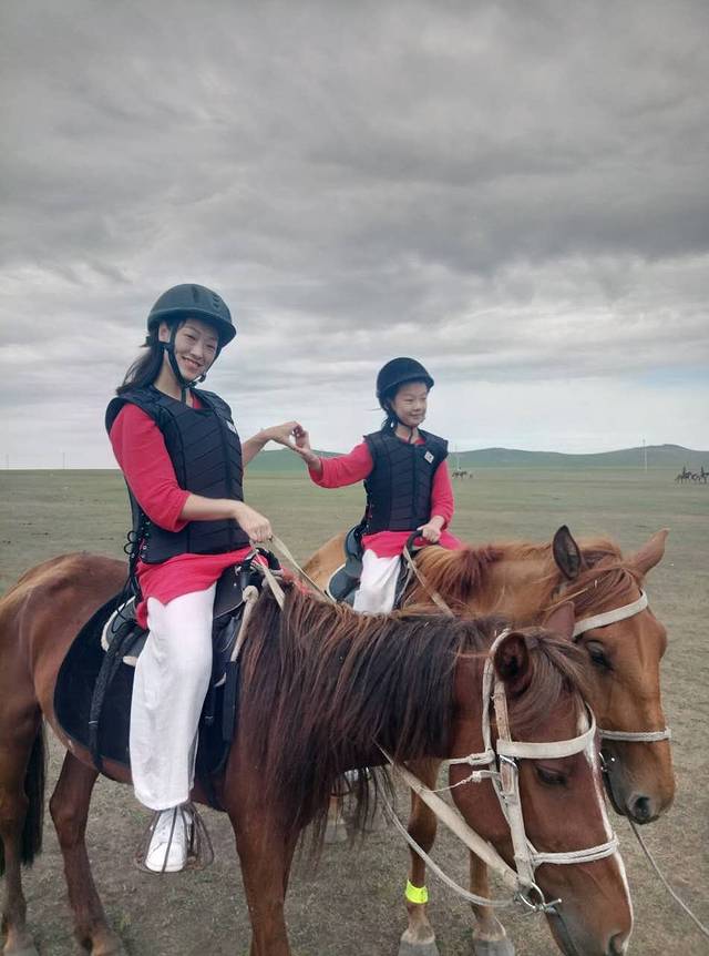 马场小哥骑着头马带着我们一路走着,马儿跑起来的时候好像要被颠飞起来。翻过山坡,眼前是一片开阔的大草原,视野特别好。可惜骑马不让拿手机。马队里四个广东游客用相机让马场小哥帮我们拍照。