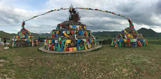 过了乌兰浩特,高山草场慢慢呈现,羊群也多了。可惜大片的羊群距离太远,手机捕捉不到影像。一个小山头上的敖包。