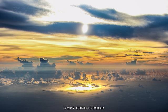 太阳终于要爬出地平线了,而天空中飘散着的云给这场日出增添了浓墨重彩的一幕。阳光映射在云上,呈现出不同的颜色,将这个天空点缀的好像油画一般绚丽。