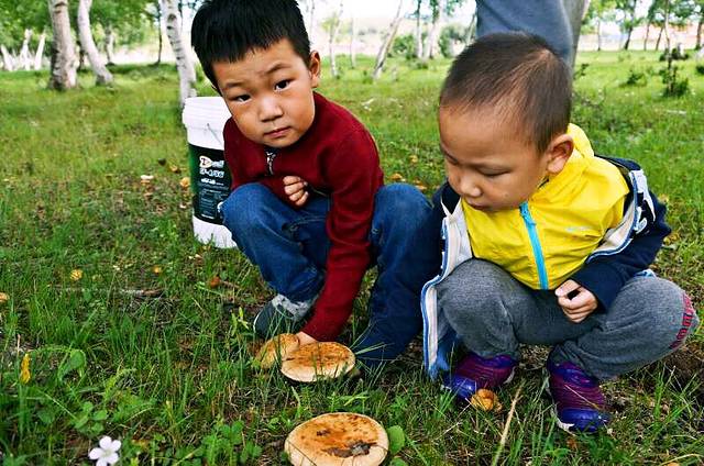 在白桦林采蘑菇