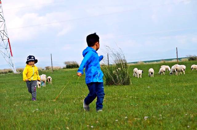 两娃娃说好的拿跟绳子去赶羊....哈哈哈哈哈....然后下张图就只说好的赶羊,反而成了被羊🐑赶...哈哈哈,羊叫了一声咩...好了,他俩都往回跑了....这次的图有些是单反拍的,有些的手机随拍的...各位将就着看吧!