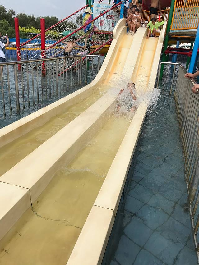 看到滑草,可可不敢兴趣,一个劲喊着要游泳,其实就是一个水上游乐园,有两个滑梯、漂流、海盗滑梯因为身高不够,可不能玩,但两个小滑梯小孩玩的就好嗨。不过可可开心就好啦!可爸带着可换了泳衣,我负责看东西,打着伞在水边等着,太阳实在好晒!