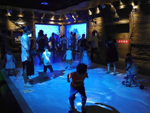 再往前,有一个虚拟主题的“踩鱼互动”很有趣也很特别,跟随着地上小鱼的光影,你一踩,它们就会溜走,许多孩子们会在那里和虚拟小鱼玩耍,看起来十分欢乐。