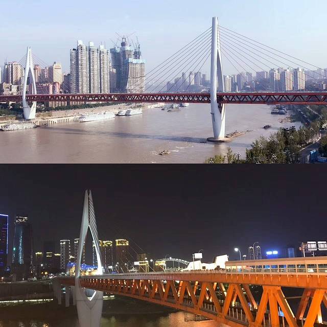 中间暗了一块的洪崖洞,千厮门大桥上的灯也没有开...不开心....