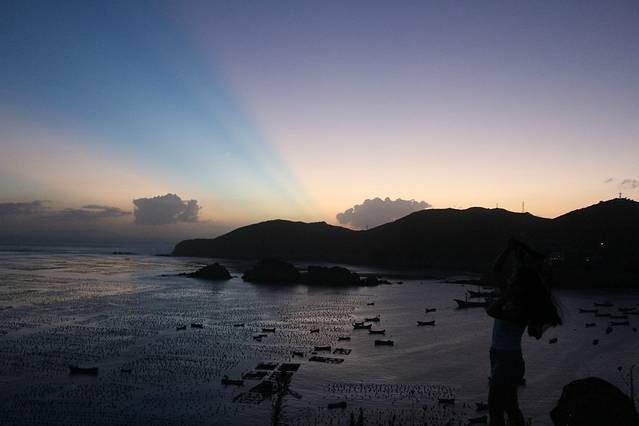 由于住在大王沙滩比较近,我们和同行的老乡取得了联系,就搭乘面的去了蓝海牧场看日落,其实很多人建议去山海奇观看,,站得高看得远的缘故吧。蓝海牧场,海上日落,夕阳西下,余光下的牧场显得格外安静。人们也纷纷离去。