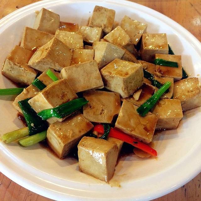 石山黑豆腐,所借助的就是在火山灰上生产的石山黑豆加工而成的豆腐。豆腐非常软,匆匆软软。这道菜终于感受到了北方豆腐的气息。