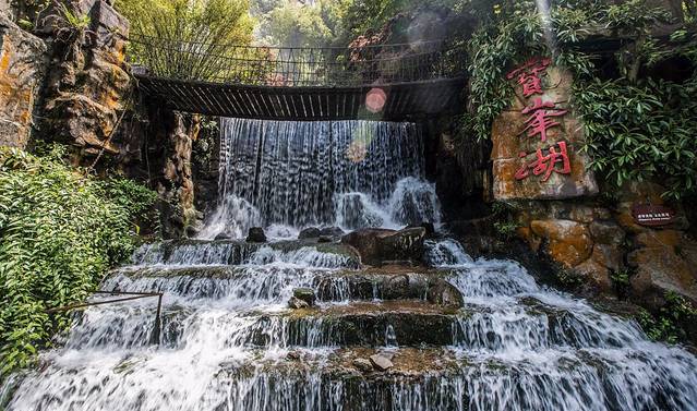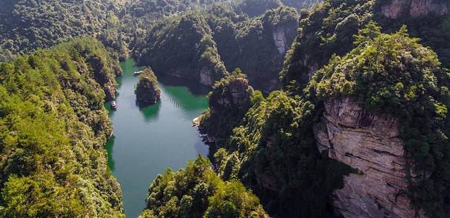 宝峰湖不大,是人工拦坝而筑的人工湖,高山之间,自然流水而下,因此水质清澈,基本没有污染。湖中心有湖心岛,乘船登临其上,恍若画中。