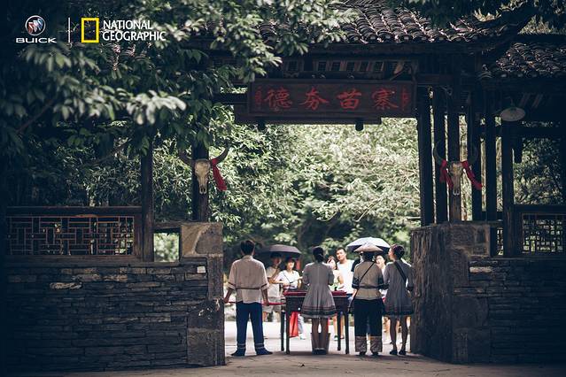 而在这样的一副水墨丹青之中怎么能少得了房屋与人烟呢?飞檐翘角,石瓦青砖,或木质,或石砌,一座斑驳秘籍的寨子就这样闯入了我们的眼帘。