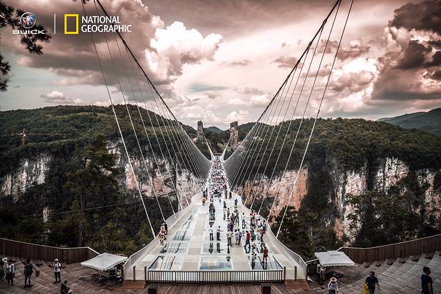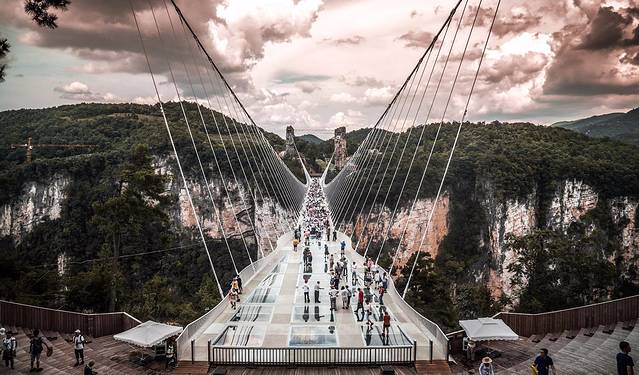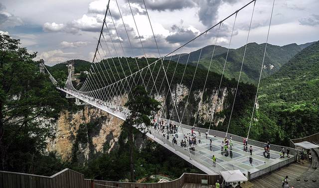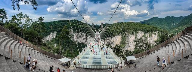 玻璃桥主跨430米,桥面长375米,宽6米,桥面距谷底相对高度约300米,这座全透明玻璃桥的长度、高度都是世界第一,所以如果你有幸到此,站在玻璃之上,就像悬停在空中,整个世界都在你的脚下。