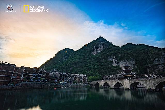 夜幕渐渐降临,镇远古镇开始显现出与白日不同的色彩来,晚霞映照半边天,另一半却全是明净的蓝色,青山与蓝天相接,晚霞笼罩古城,这如画般的美景倒映在河面上,整个画面都带上了宝石一样的蓝色,纯净而透彻,是镇远古镇此时的颜色。