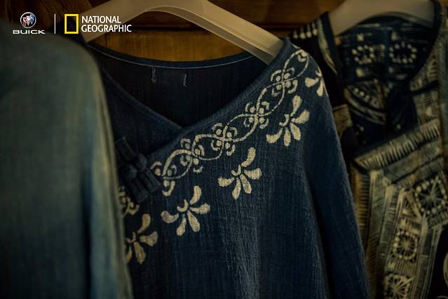 千户苗寨中的苗族衣裳多少以青土布为原料做成,在配上特有的刺绣图案和技术,形成了寨里人们的特色衣裳。