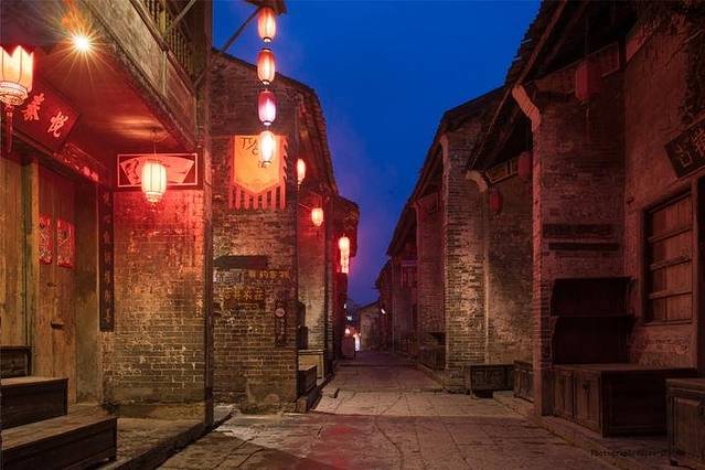 夜晚,古老的街道,红色的灯笼,这样的夜晚恍如隔世,街道全部用黑色石板镶嵌而成,镇内建筑按照九宫八卦阵势布局