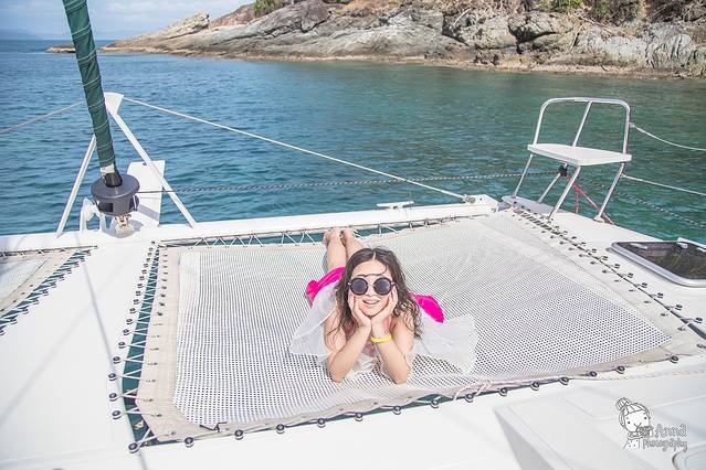 我自然是最安奈不住的那个了,一上船就跑到网兜上霸占着位置,哈哈哈,其实是大家都在下面一层的舱内躲太阳,我一不小心就包场了,有些晒,但并不热,躺着是一种十分清爽的感觉