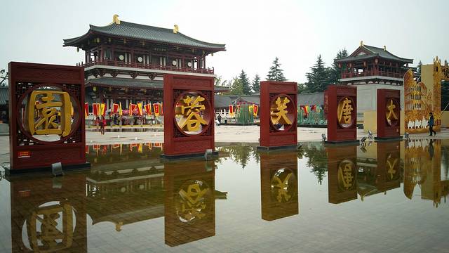 大唐芙蓉园内建有紫云楼、仕女馆、御宴宫、杏园、芳林苑、凤鸣九天剧院、唐市等许多仿古建筑,是中国最大的仿唐皇家建筑群,景区由中国工程院院士张锦秋担纲总体规划和建筑设计。它是在原唐代芙蓉园遗址以北,仿照唐代皇家园林式样重新建造的,是中国第一个全方位展示盛唐风貌的大型皇家园林式文化主题公园。