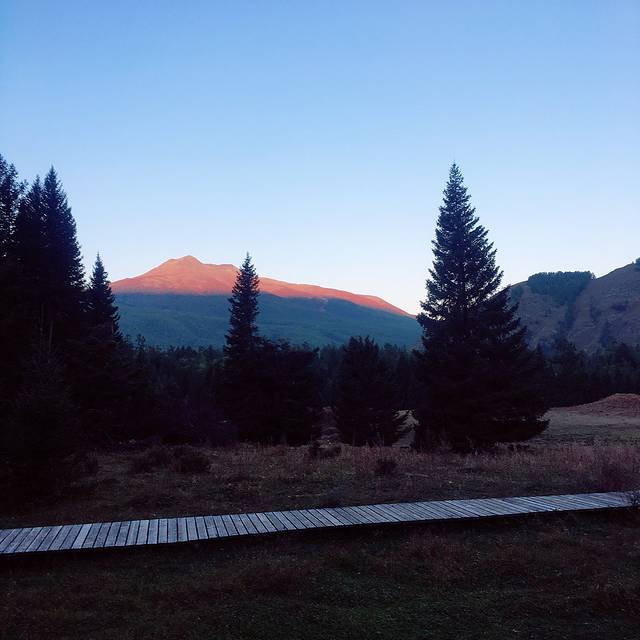 晚上夜宿喀纳斯村的小木屋,第二天我们起了个大早徒步去一道弯山顶。