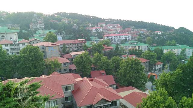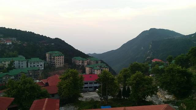站在山顶上看林中的别墅,错落有致、建筑畸形的幢幢别墅,浮沉在波峰浪谷中,那深红色的、青绿的铁皮屋顶,像朵朵鲜艳的蘑菇,散落在青苍的山谷里。