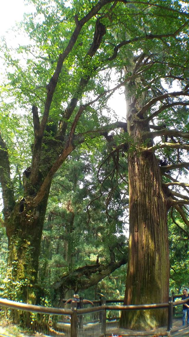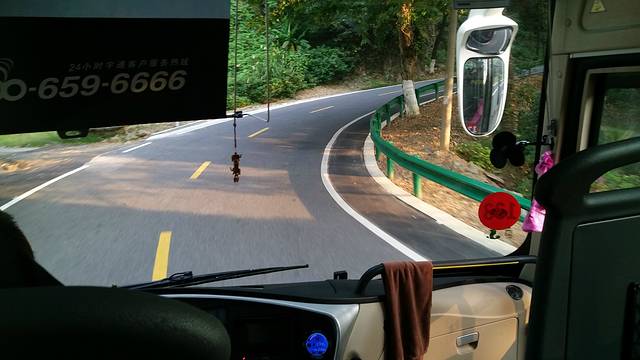 在上山的观光车上!观光车行驶在庐山那曲折蜿蜒如盘龙般的公路上,青翠欲滴的参天大树如卫兵般屹立在路边,俨然如同道路的守护者。这样的公路犹如行驶在山城重庆一样!