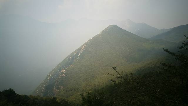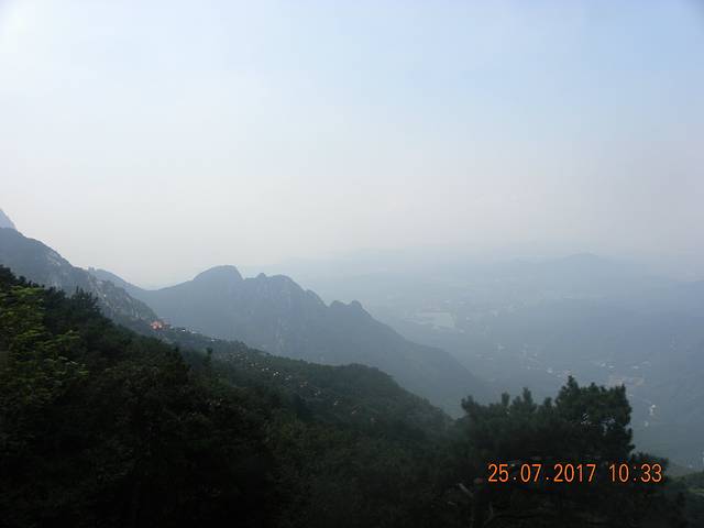 应证了宾馆老板的建议是正确的,昨天是中午13时左右,太阳和阳光正好。大雾笼罩在远处一座高耸入云的大山的山腰上,犹如一条苍龙直入云霄。雾越来越大,天地像被一张巨大的纱帐笼罩住了。