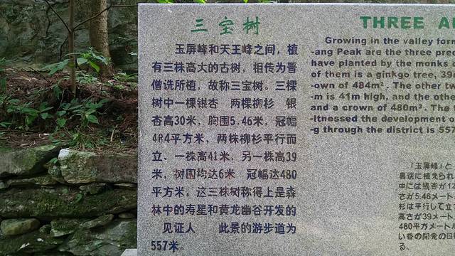 三宝树相传为千年古树,树下石碑上镌有“晋僧昙诜手记”6字。宝树已被重点保护。