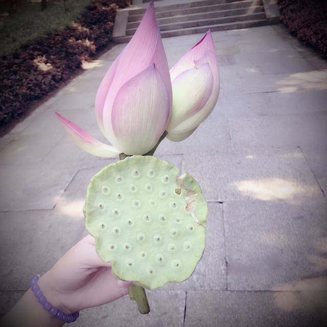 上岸后,划船师傅又喊住我们,给了我两支荷花