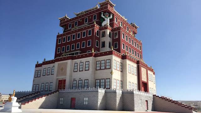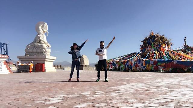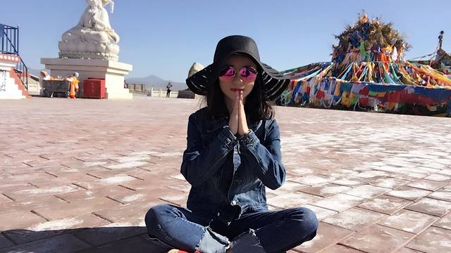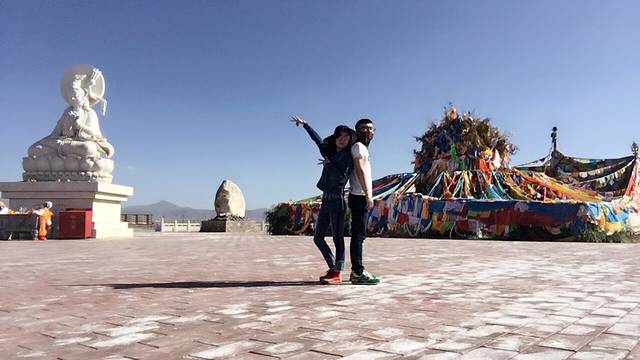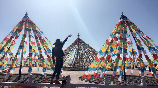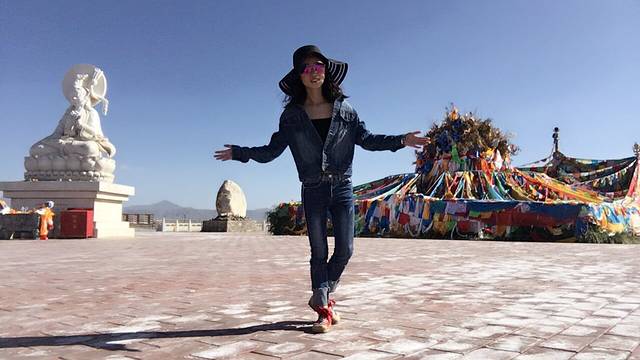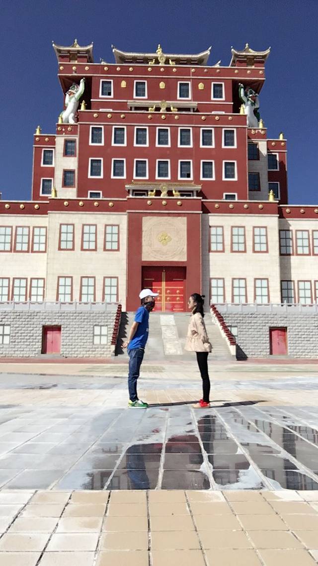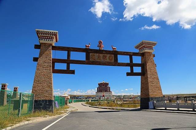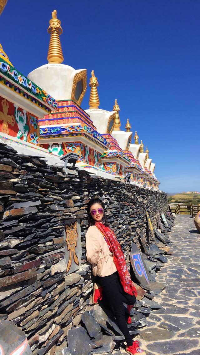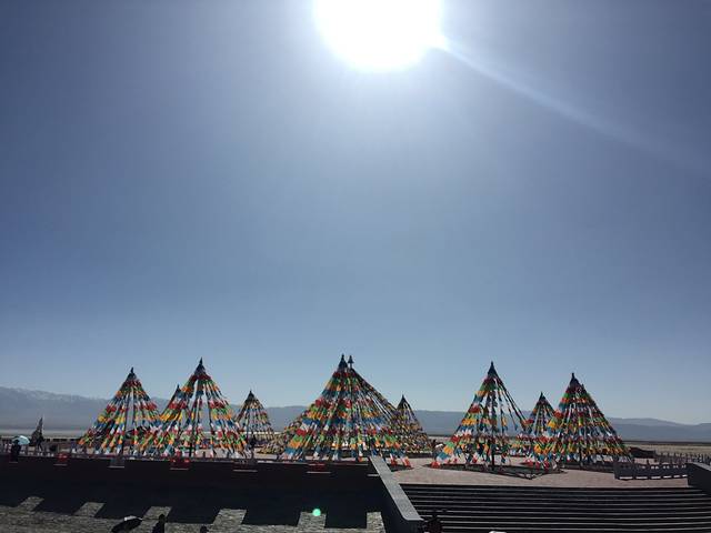 吃完午饭本来打算继续赶路(因为要在下午6点前赶回西宁还车),却看到远处有一些奇怪的建筑在阳光下泛着金光(没有夸张,是真的很耀眼),车子兜进去一看,是一个感觉刚建成的寺庙?四个角有着一种表情用力的动物?附近都是大片大片新修建的房屋,不远处看到了一排藏式宝塔,因为此前时间关系放弃了塔尔寺,而塔尔寺我想拍的就是如意宝塔!真是得来全不费功夫,于是车子又往回走找宝塔所在地的入口,原来就是青海湖前往刚察县收费站过去一点点路的右手边,之前开过头了。宝塔所在地叫做【湟鱼公园】,可能是类似我们这边的市民休闲公园吧,应该也是刚弄好,又是个“无人区”!里面设计如意塔、经幡、尼玛堆、还有柬埔寨吴哥窟似的石堆,供周边群众前往礼佛游憩的。