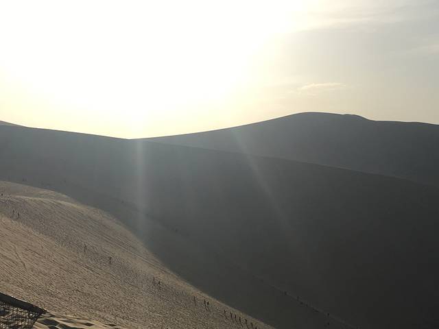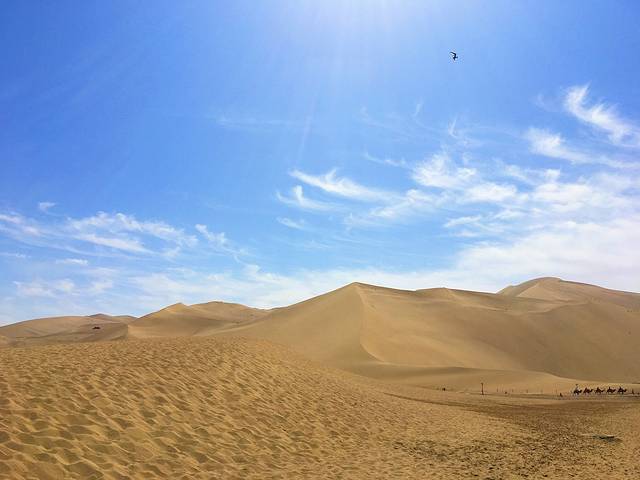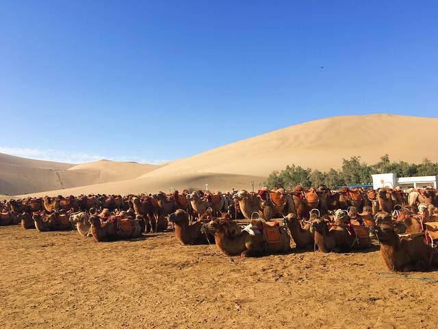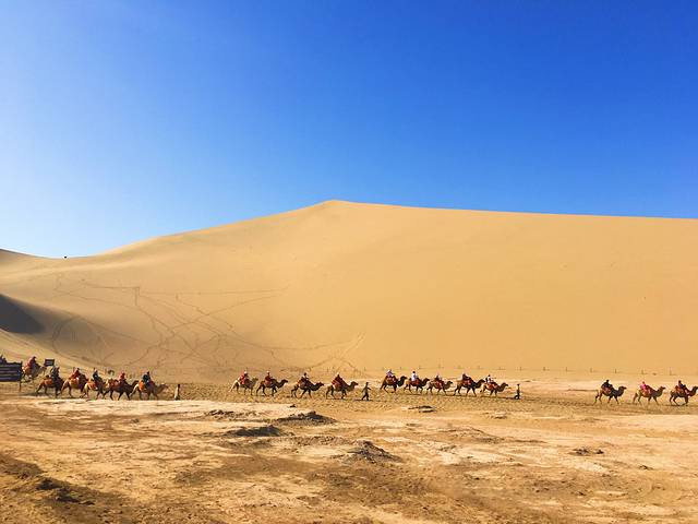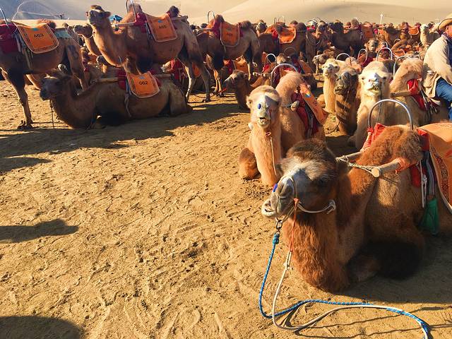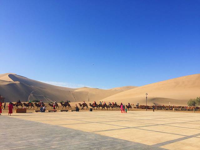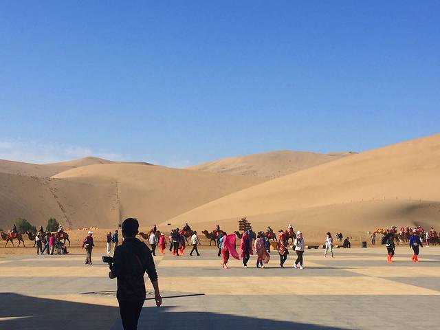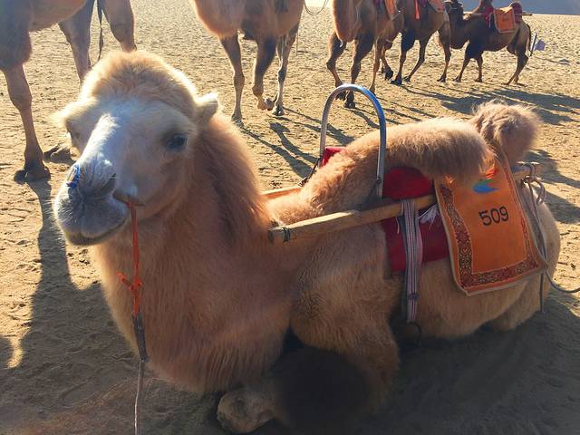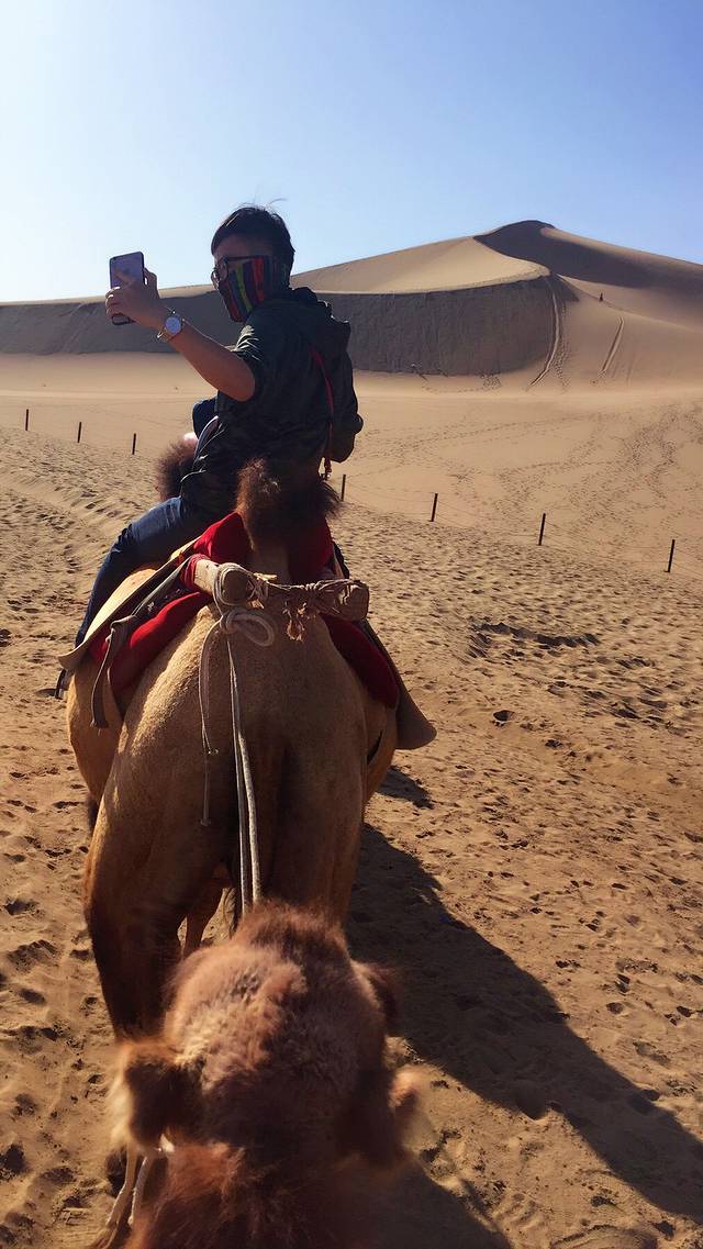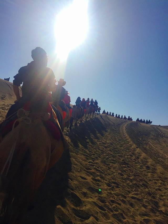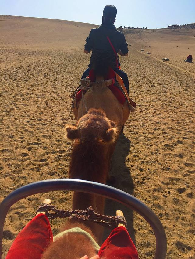 9点半到景区门口,想着这辈子还没骑过骆驼,总要去亲近一下萌萌哒的骆驼,进门右手边就是【骆驼骑乘点】,大老远就闻到一股酸爽的味道。骆驼骑乘是100元/人,买票后拿着编号排队就会有师傅过来安排,凑满五只骆驼一队出发,每队都有牵引师傅,我人小就被安排坐了一只小骆驼,而代傻吊坐一只巨大的。行进的线路是从骑乘点——滑翔伞、摩托运动基地——小山顶——下山(坡度很小)——月牙泉,骆驼比骑马那屁股是舒服多了,行进中远处一队队骆驼慢悠悠的在背光阴影处,倒真的一瞬间有古时候商队运输货物的感觉。因为在骆驼上摇晃拍照不便,而且行进带起的细沙非常多,根本不敢把相机拿出来,途中会有景区工作人员给拍一张照,全部洗出来就是鸣沙山留念那种staly,放在景区门口售卖,牵引师傅也会问有没有人要拍照,20元/人,全程不限张数,这也算是外快吧,可以在骆驼下拍到不同角度的。