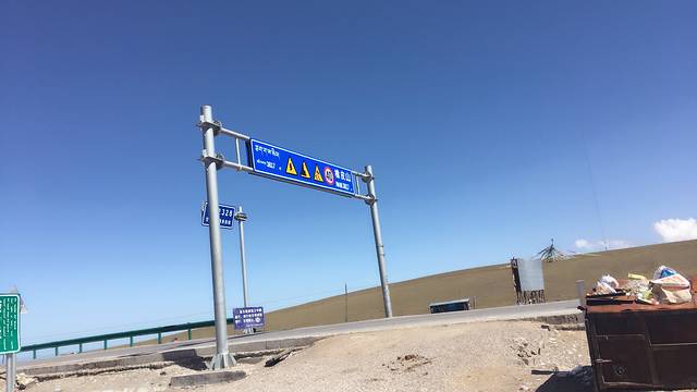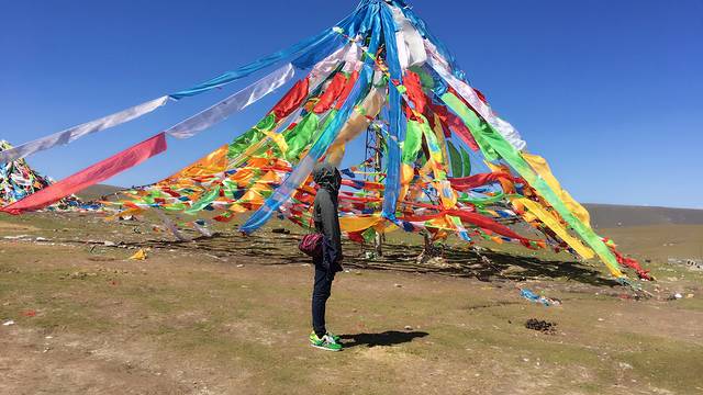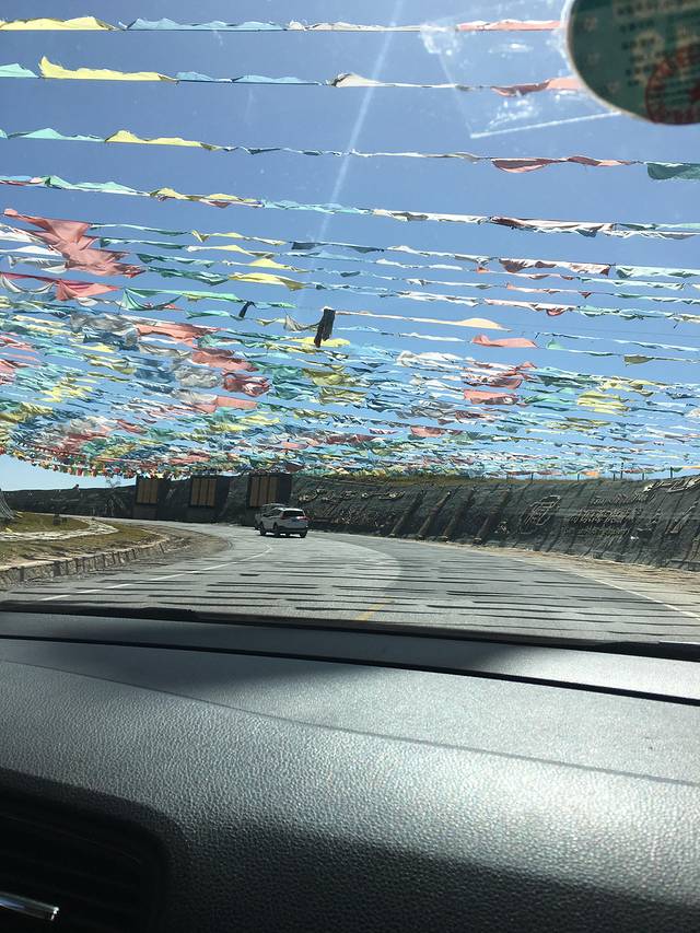 想着今天要去茶卡,赶紧翻越【橡皮山】,一路上都是草原山坡,一群群小绵羊就像棉花糖一样粘在山坡上,可爱极了。橡皮山最高处海拔有4000多米,略微有点耳聋耳鸣。途径最高点的时候看到一大片【彩色经幡】,这是我见过最漂亮的经幡,之前看到的那些都是小彩旗,于是靠边停好车换装上阵拍拍拍,风无比的大,气温很低,傻吊浩很不耐烦了因为我到处找地方换衣服。