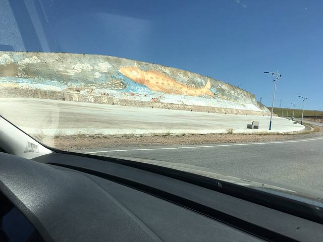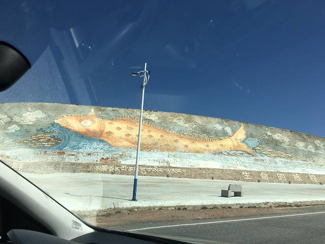 继续往前开10分钟,看到一个大【广场】,上面绘着很大条的湟鱼,很多自驾游、旅游团停下来拍照,下面用藏汉两文写着青海湖畔、生命的辉煌。“青海湖中有两宝,一是湟鱼二是鸟”,因为是咸水湖,湟鱼也是青海湖中唯一的鱼类,是国家二级保护动物。接下去有个上坡,刚转了个弯就看到这么一大片经幡和大大小小的尼玛堆,地上白花花的不是垃圾,而是一张张经文,车子开过带起一片经文飞舞。