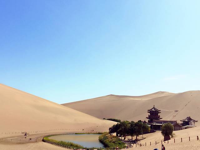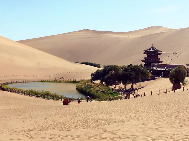全程大约1个半小时,我们在【月牙泉】附近的骆驼骑乘点下了,和之前沙漠不同,于是看到的就是人人人人人人,在月牙阁下的图片展示中心看到上百年前的老照片,很难想象以前的商队在一片荒漠之中翻山越岭突然看到这一汪绿洲会是如何的感动,后面这一百多年大家都做了很多的努力要留出这一水的清泉。月牙阁和附属建筑很漂亮,也许不应该用漂亮这个词,是大漠中苍茫的颜色,屋檐瓦盖上都是蒙蒙的一层细沙,如果没有人的时候在阁楼上发呆看着层次尽显的荒漠应该也是浪漫。