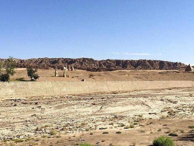 鸣沙山月牙泉在敦煌就感觉是城市公园似得,因为距离市区很近,在城里就可以看到远远的一处沙漠。我们在敦煌的住宿是在鸣沙山边上【月牙泉村】的一个旅馆,叫青艺寓舍,艺龙定的,那里算是当地政府规划弄得一个农家乐特色村吧,全部都是大大小小的旅馆、青年旅舍,条件应该也差不多,我定的这家还挺干净,一共两层,三楼露台看出去就是鸣沙山,走路到售票中心入口大概10分钟,特色村门口就是3路公交车,所以去城里也很方便。
