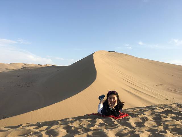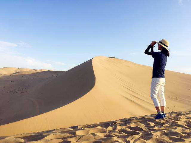 今天一天都是安排在【鸣沙山月牙泉】,行程缓一缓,因为中午真的很热,所以早晚进去是比较明智的。原来打算去看日出结果6点多掀开帘子发现阴沉沉的,果然继续睡懒觉。大概睡到9点起床,吃了早饭,摸了一层又一层防晒霜,保护好相机,出门了,恩!天空很蓝!太阳出来了!