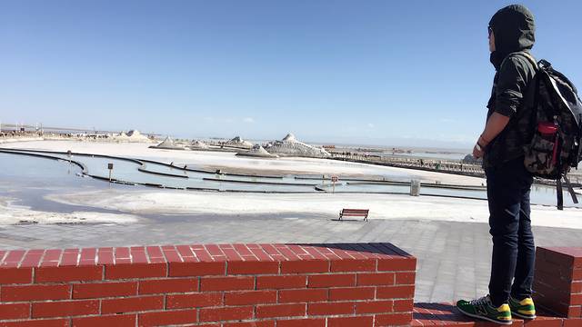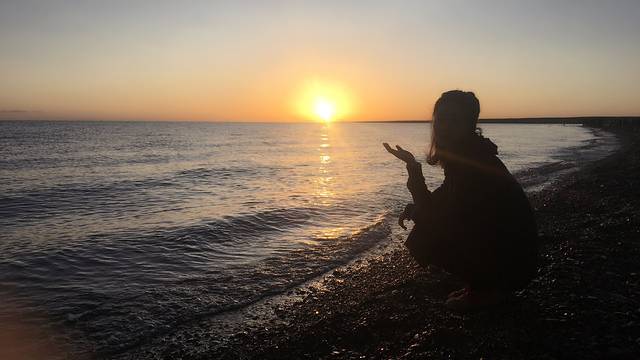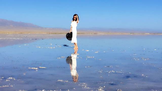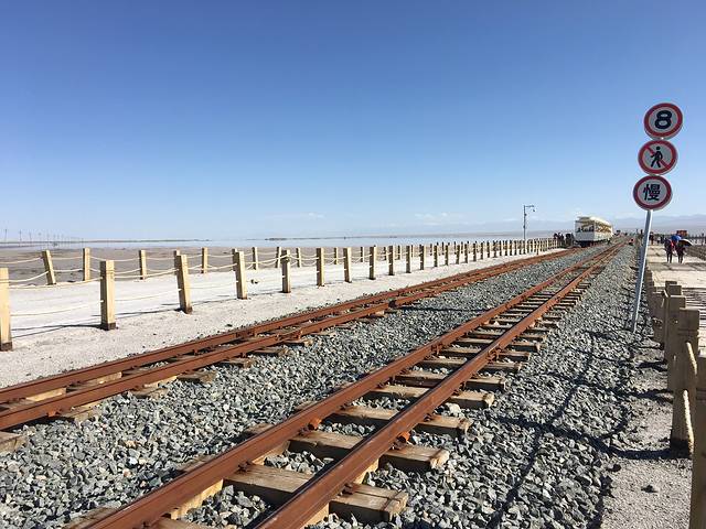 到茶卡停车场时已经是四点多,买了门票(全票50元/人,学生证35元/人,简直是捡到的优惠)然后车子直接开到里面的停车场(10元停车费),首先看到很多盐雕,再往前走就看到铁轨,还有轰轰轰的小火车,路边很多租鞋套的,10块、15块一副。我之前网上就买了透明鞋套,穿好鞋套,走向盐湖拍拍拍,起初代先生拍照技术找不到感觉,通过观察找到了最佳拍摄地(如下图)建议小伙伴们还是穿鞋套不然走起来还是很扎脚费力。大概6点半,落日的霞光真是美极了,但是为了赶上最后一班小火车不得不选择撤了。