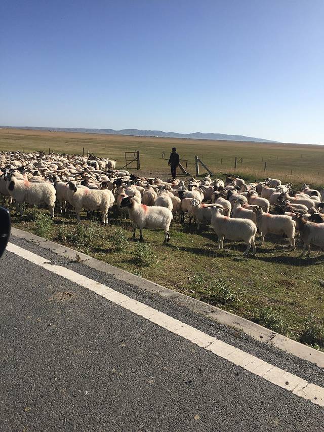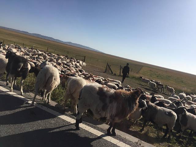 今天一路看到比较多就是牧民们大片大片的牧场,所以经常会看到藏民们赶着一群羊、一群牦牛或是几只藏獒过马路,羊咩咩呆萌的样子真是可爱极了,我俩每次碰到过马路的都会停下来慢慢看它们过去,当然也会有几只略蠢萌的停下来看着我们这种移动的黑色物体。
