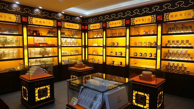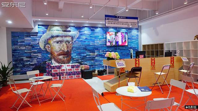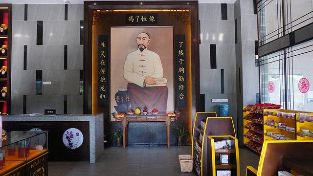 一进国医馆一楼大门,就看到墙上有一副大大的画像,原来这就是明朝冯庙冯了性的头像,仔细一看,这幅画像,是用九块的陶瓷砖画拼凑而成,相当精美呀!