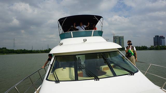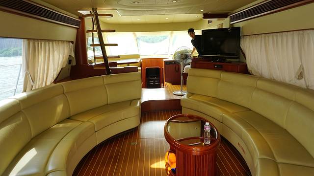 看一下游艇内部,可以几十个人一起乘坐,里面喝茶,外面吹风。