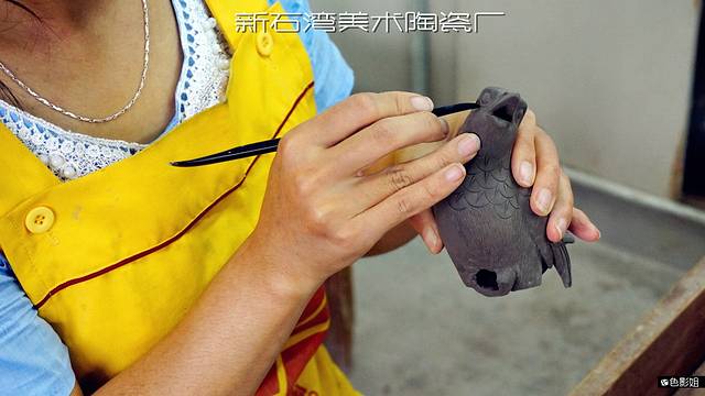 泥坯成型之后,还是表面处理的工作了,举例说一只小狗,要用特制的刀具,在它的身是上划出一条条的纹理,看起来就是狗狗的毛,这个工作也需要娴熟的手艺,方向一致、深浅得当,这样狗狗的毛看起来很顺。一个工具就铅笔那么大小,所以画狗毛毛也是很费心费时。