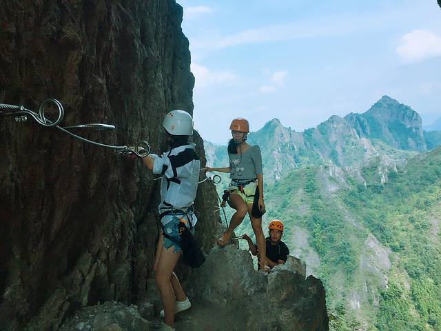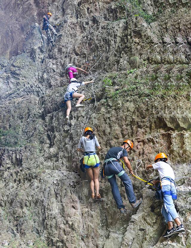 穿上护具,扣上安全绳,踩在悬崖石头上设置的钢制U形爪上,手脚并用,一步一步往上攀登。