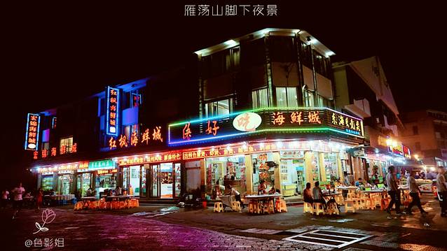 从雁荡山山庄出发,走几百米就到了镇上最热闹的地方,目测是餐饮一条街,灯火通明,有好几家海鲜排档。