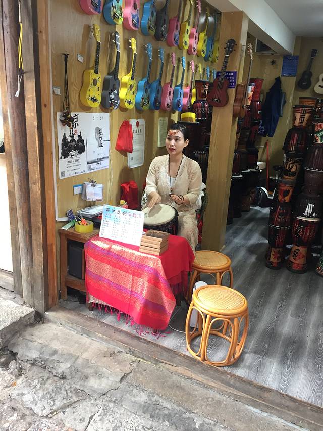 丽江有很多这种卖鼓的店,里面坐个美女老板娘,当然不一定是老板娘。