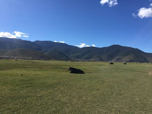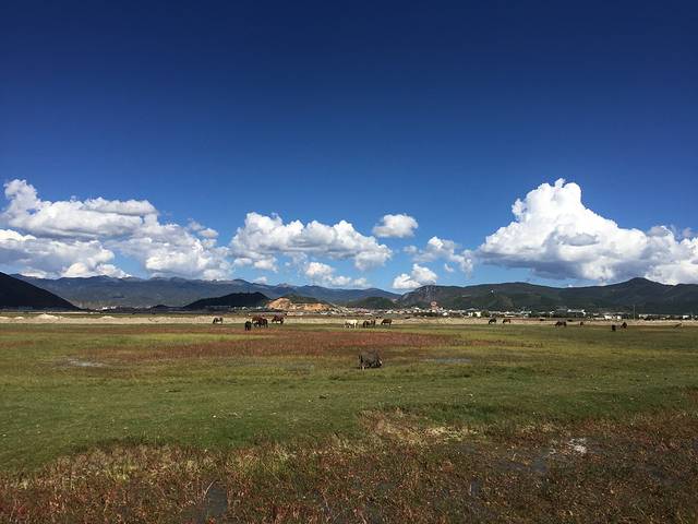 一路往上,来到了伊拉草原,雨季的时候,这里就是纳帕海。天很蓝,牛,马,猪在草原上悠闲的吃草,很美丽和谐的画面。这边的牛羊马什么的,除了藏獒都是放养的,所以在这种美丽和谐的环境下,脑子里面都是就地架个烧烤架烤牦牛,烤藏香猪的画面,讲真,在伊拉草原旁边的藏民家吃了,真的很好吃。