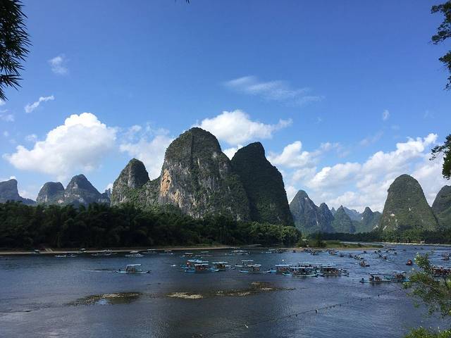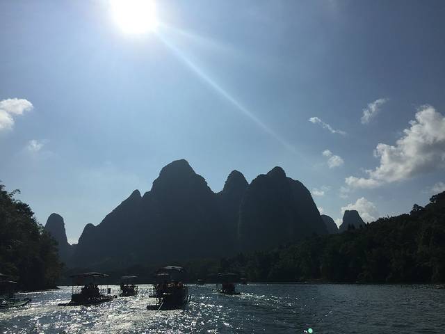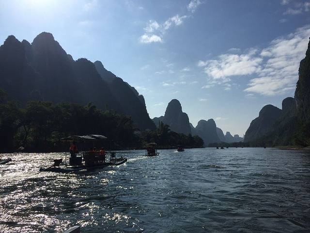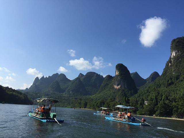 漓江竹筏,1号晚定好的竹筏115一人,从杨堤码头游到九马画山,然后坐景区电瓶车到兴坪古镇20元观景点下车,我们定的是单程的竹筏,所以就把车停到了阳朔。因为取票的时间是早上9点到9点半、中午12:00-12:30,下午13:00-13:30,为赶上第一趟,早上7点出门,到加油站大转盘的地方坐阳朔去杨堤的客运车15元/人,不要坐阳朔去往桂林的车,因为那个需要到杨堤以后还要换乘,太麻烦。直接坐去往杨堤码头的客运车就行,大概1小时10分钟,因为是农村客运要上下客,所以比较慢,我们7点半出发8点45左右到,码头下车后就去换票的地方换票,然后排队,十一期间人很多,不用担心拼筏的问题,4人/筏,补空位30元/人。如果要筏工讲解的话单独付费,旁边的一个筏付了50元,筏工就讲解了一下而且竹筏速度也放慢了一点,我们的阀工比较腼腆,也没问我们要不要讲解,所以一路上都有比较安静。大概漂了50分钟,我们还是漂的比较慢的