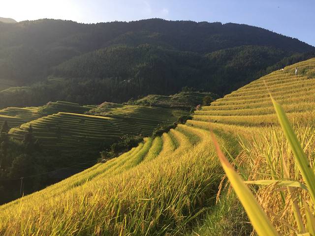 大概2个半到3个小时到龙脊景区,1-8号网上不能订票,所以到了景区门口有很多买票的妹子和检票的帅哥,95/人。景区总共有4个景点,票价是套票,一天看不完的话不出大门可以继续看,如果要出大门的话需要登记,这样第2天才能避免麻烦。我们本来打算下午看完4个景点,至少看2个景点后直接离开的,没想到景区人太多堵车了,山路窄,车多,停车位有限,所以只能是有人离开有车位才让上山的人进,而且停车位都是临时的不是规划好的停车场,有2个小的停车场因为山上地理位置吧,只有当晚住在寨子里的人才能停在里面,我们就把车停到了最顶上的停车场,然后在上山看花海,下上看梯田。景区有4个观景的地方,古壮寨梯田(龙脊梯田),平安族梯田,金坑、大寨族梯田,我们去的第一个是平安族梯田,这个观景区的景色其实还挺不错的,