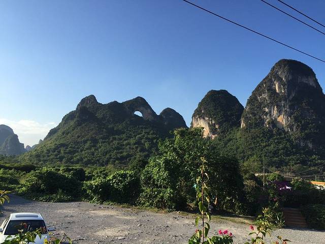 拍完照后走8分钟左右到古镇,兴坪古镇并不大,随便参观一下,一人一碗米粉就解决了中午饭,吃中饭的时候就顺便把蝴蝶泉和银子岩的票定了,套票120元/张,不过蝴蝶泉要下单后1小时才能取票、银子岩是4小时,起初是决定下午玩2个景点的,不过到蝴蝶泉才知道能玩完一个就不错了。然后从汽车站坐车回阳朔车费10元/人,1小时左右,上车问师傅说你到哪里去,他会告诉你最近的下车点。蝴蝶泉、大榕树、月亮山是在十里画廊里的,起初我以为十里画廊是一个景区需要门票的,后来去了才知道十里画廊就是一段风景区,在这段风景区里各个景点的出入口就在里面。因为十一客流量多,所以7:30到19:30这段时间是不允许机动车进去的,只有电动车或自行车才能进去,因为不知道还有一条新道可以把车开到十里画廊中间的一个出入口,所以就傻傻的把车停到县里,坐公交车去的路边下车后走路10多分钟就到十里画廊路边。下车往里走2分钟就能看到一个大月亮,那就是月亮山,很庆幸不用买票就能收获一枚月亮。
